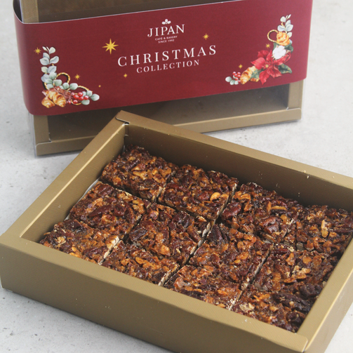 Buttery shortbread layered with rich caramel and topped with a generous crunch of toasted pecans - a festive favorite for the season.